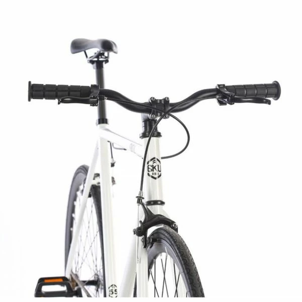 L’Evian 2 de 6KU est un vélo complet singlespeed/fixie cohérent à tous les niveaux. La première chose qui attire l’attention est la peinture blanche, de très haute qualité. En combinaison avec les jantes à rebord élevé fabriquées en interne. La transmission fonctionne classiquement via un moyeu flip-flop, avec lequel vous pouvez rouler en singlespeed ou en fixie.