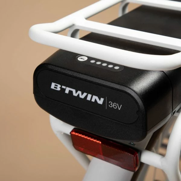 La batterie amovible et sécurisée à l’aide d’une clé peut être rechargée sur une prise secteur soit sur le vélo soit en le retirant de celui-ci. Un chargeur est fourni à cet effet sur le vélo.
